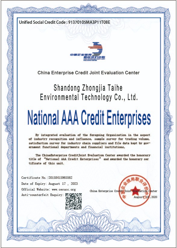 凭借诚信经营的原则以及蓬勃的行业发展前景和良好的社会口碑与公众认可度,近日,山东中嘉泰禾环境在企业信用标准认定中顺利通过AAA信用体系认证,荣获“全国AAA级诚信企业”单位。这标志着中嘉泰禾环境在规范运营、诚信经营上得到了相关权威机构的认可和肯定。